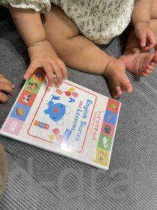 読み聞かせの仕方ですが、赤ちゃんの目から20センチくらいの位置で、表紙や中のページを見せています。