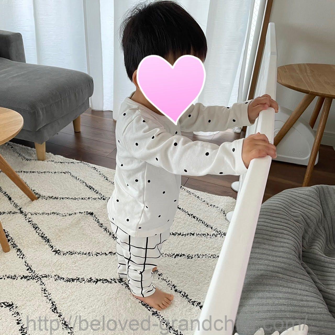 前回はMサイズにして1歳5ヶ月の孫が着た感じはこちらです。